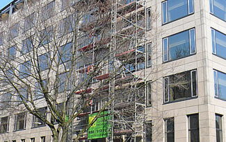 MODULE- Mastklettergerüste Typ MSM-2 mit Plattformverbreiterungen um 2,00 m von 1,50 auf 3,50 m. Diverse Sonderlösungen aufgrund der eingeschränkten Verankerungsmöglichkeiten. Anspruchsvolle Logistik in der belebten City.